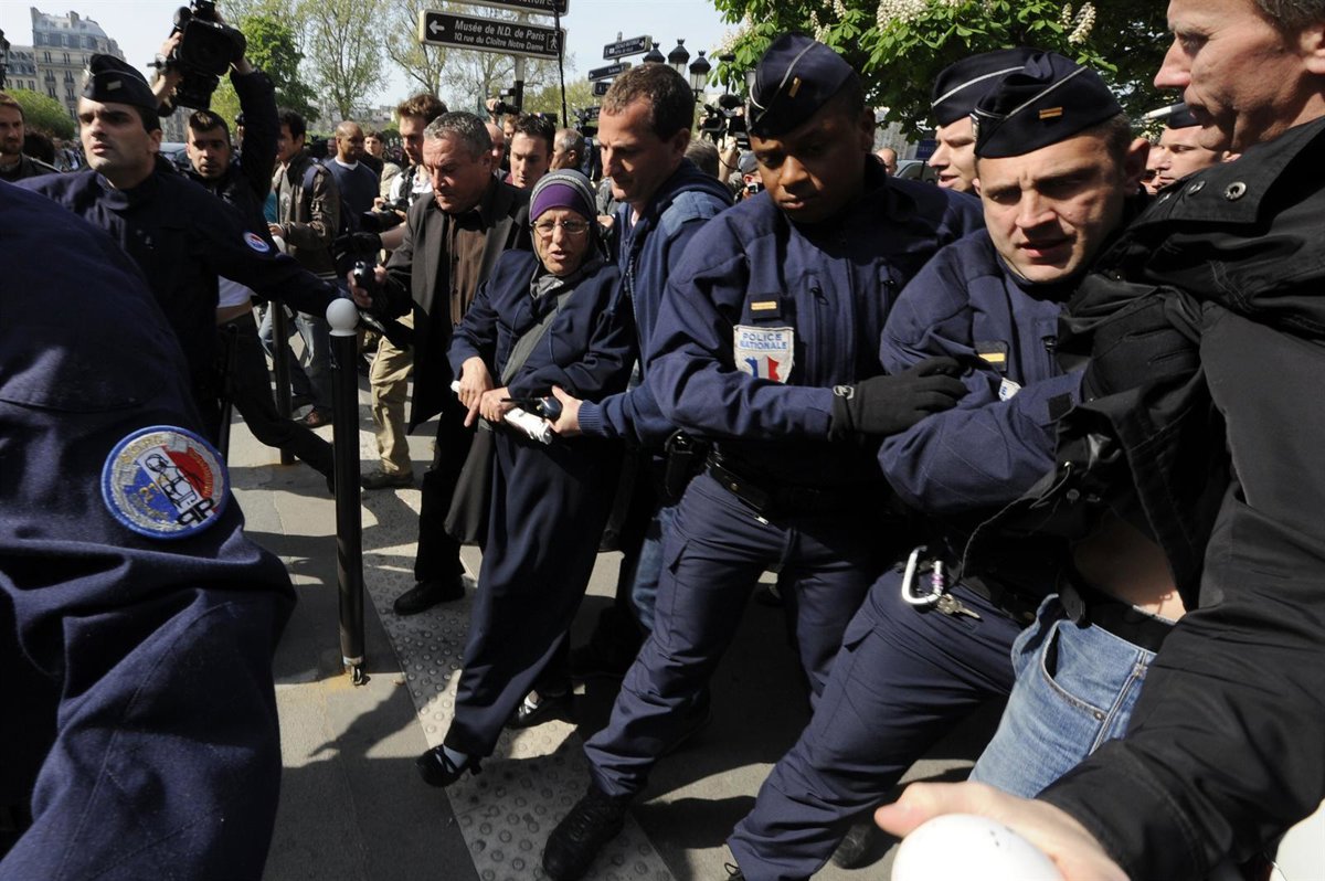 Decenas de personas se congregaron por la mañana ante la catedral de Notre Dame, en una concentración que no contaba con permiso de las autoridades y que se ha saldado con el arresto de dos mujeres que portaban niqab. El portavoz policial Alexis Marsan ha aclarado que el arresto no se debió a la utilización de la prenda típica musulmana, sino a la participación en una marcha ilegal, informa 'Le Parisien'.