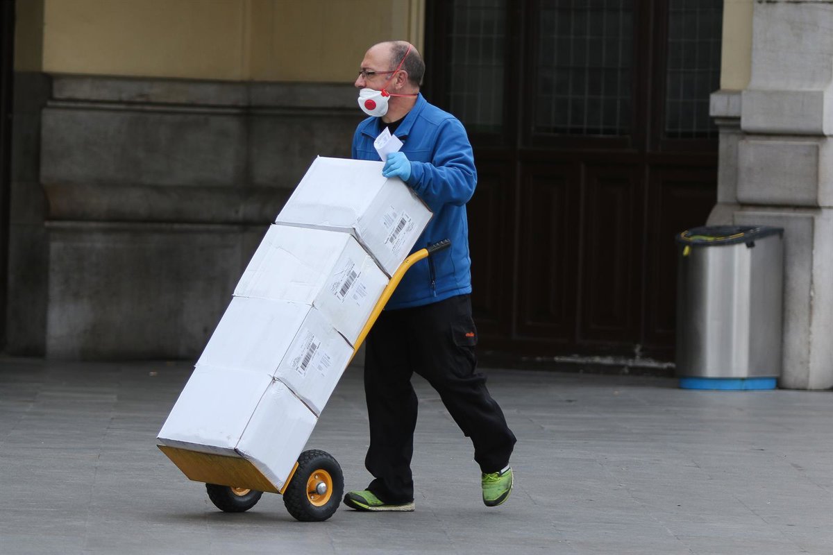 Un hombre con mascarilla y guantes carga con cajas. - Iván Terrón - Europa Press