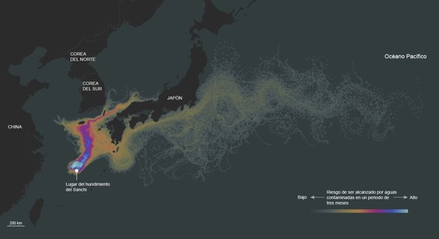 El petrolero iraní 'Sanchi' se hundió el pasado 14 de enero en el Mar de China Oriental tras colisionar con un carguero, provocando la muerte de 32 tripulantes y el vertido de más 136.000 toneladas de crudo ligero. La zona del naufragio está próxima a fuertes corrientes oceánicas que podrían trasladar el vertido hasta las costas de Japón y Corea del Sur.