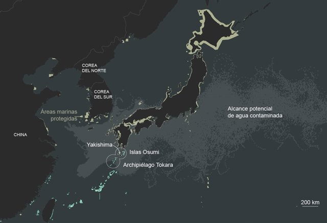 De acuerdo a esta animación, las partículas contaminantes permanecerían posiblemente en aguas abiertas, cerca de lugar del naufragio, hasta dos semanas después pero, tras el primer mes, podrían desplazarse hacia las pequeñas islas del sur de Japón y, desde allí, a lo largo de la costa nipona. Otro gran grupo de partículas podría viajar al norte, hacia la isla surcoreana de Jeju.