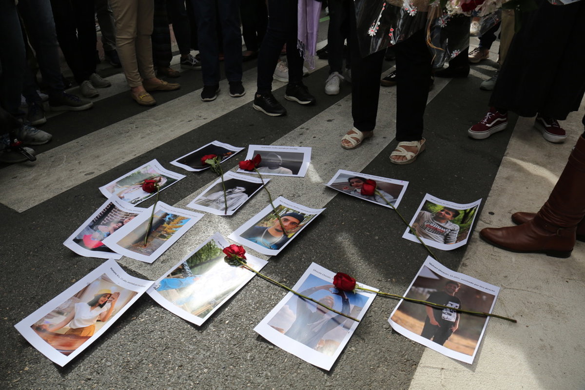 Archivo - Imágenes y rosas rojas de los asesinados en Irán durante las protestas por la muerte de Masha Amini, frente a la embajada de Irán, a 28 de septiembre de 2022, en Madrid (España) - Cézaro De Luca - Europa Press - Archivo