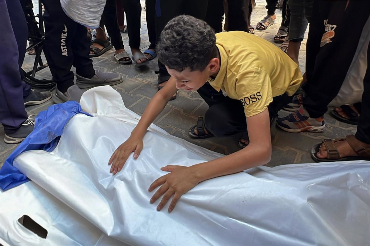 Un palestino junto a los cadáveres de varios muertos por un ataque de Israel contra un punto de recogida de agua en el campamento de Nuseirat, en la Franja de Gaza (archivo) - Belal Abu Amer / Zuma Press / ContactoPhoto