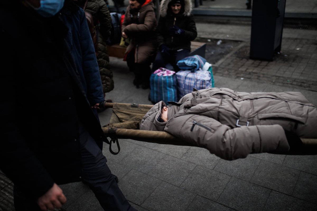 Una mujer que vino de Járkov es trasladada en camilla a 4 de marzo de 2022 en la estación de tren de Lviv (Ucrania). Ucrania cumple nueve días sumida en un conflicto bélico tras el inicio de los ataques por parte de Rusia, el pasado 24 de febrero. Duran - Alejandro Martínez Vélez - Europa Press