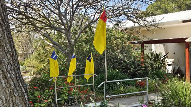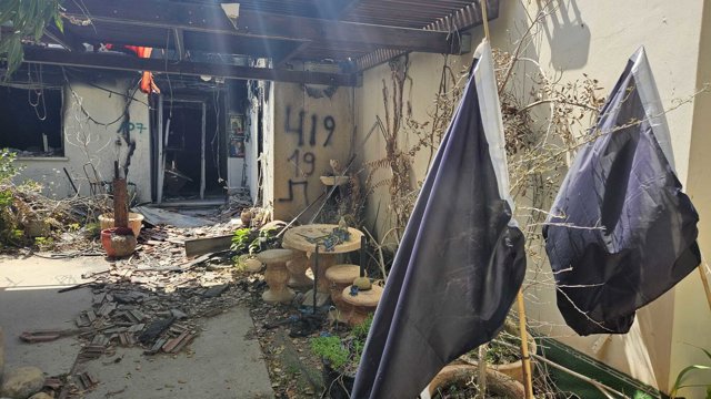 Delante de cada una de las casas del kibutz hay colocadas banderas. El negro, para recordar a quienes fueron asesinados aquel día, y el amarillo para quienes vivieron para contarlo pero fueron capturados por los terroristas. Pero también en estas banderas amarillas hay diferencias: una pegatina azul, con la palabra "liberado" en hebreo, para quienes han sido puestos en libertad o rescatados, y una pegatina roja, con la palabra "asesinado", para quienes han muerto durante su cautiverio.