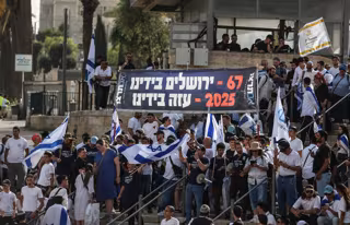 Una pancarta de la organización derechista Im Tirtzu en la Marcha de las Banderas en Jerusalén insta a Israel a anexarse Gaza en 2025 igual que Jerusalén Este en 1967. - Europa Press/Contacto/Saeed Qaq