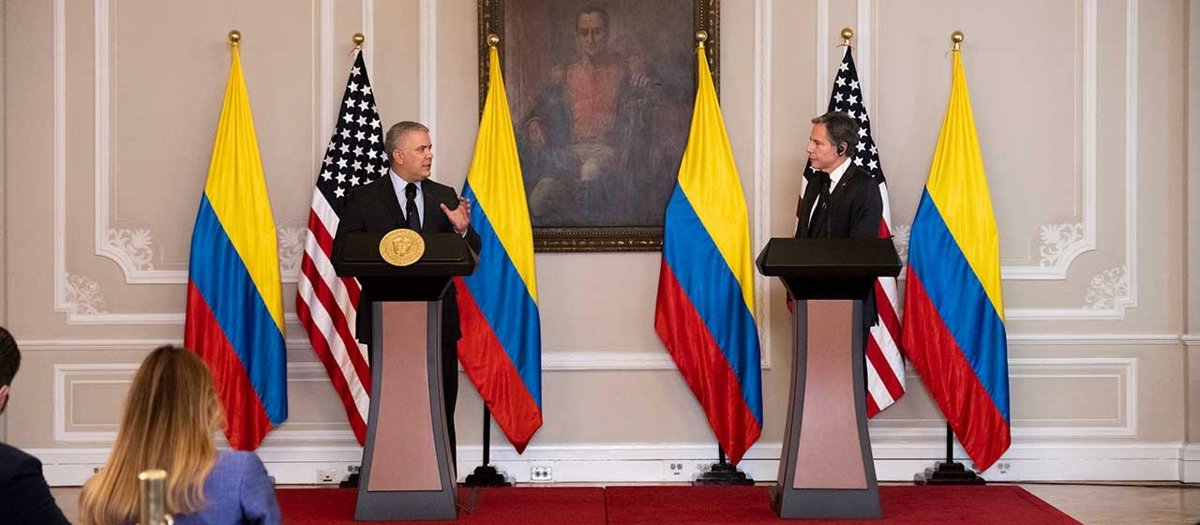 Tras concluir el encuentro entre los líderes, el presidente de Colombia ha asegurado que la visita de Blinken "es muestra de la solidez" de la "relación histórica de 200 años con Estados Unidos" y "ratifica el trabajo conjunto y permanente con el presidente, Joe Biden, quien ve en Colombia un amigo y uno de los aliados más importantes en la región".