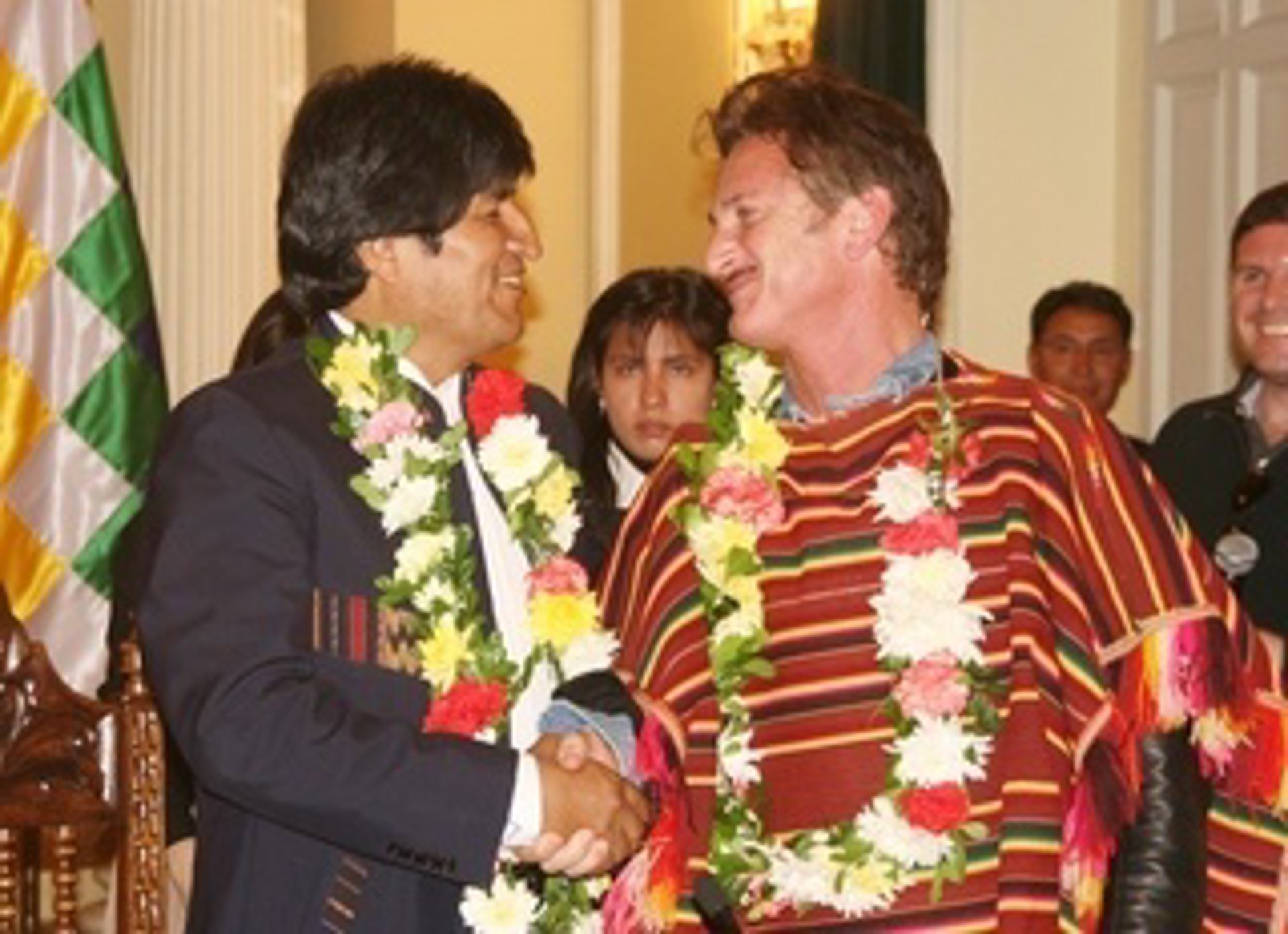 En agradecimiento, el mandatario boliviano regaló a Penn un poncho tradicional de la población de Tarabuco, un libro con las memorias de Ernesto 'Che' Guevara y una guirnalda de flores tradicionales de esa nación sudamericana.