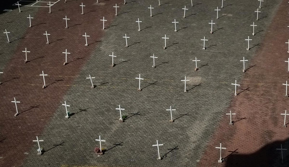 Cruces frente a la iglesia de Nossa Senhora de Caravaggio durante un acto conmemorativo por los fallecidos por la pandemia.