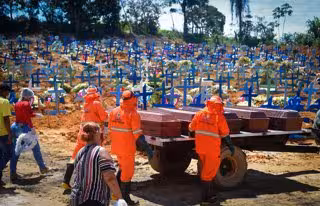 Trabajadores del cementerio de Manaos, capital del estado de Amazonas, portando ataúdes de víctimas del nuevo coronavirus. - Chico Batata/dpa