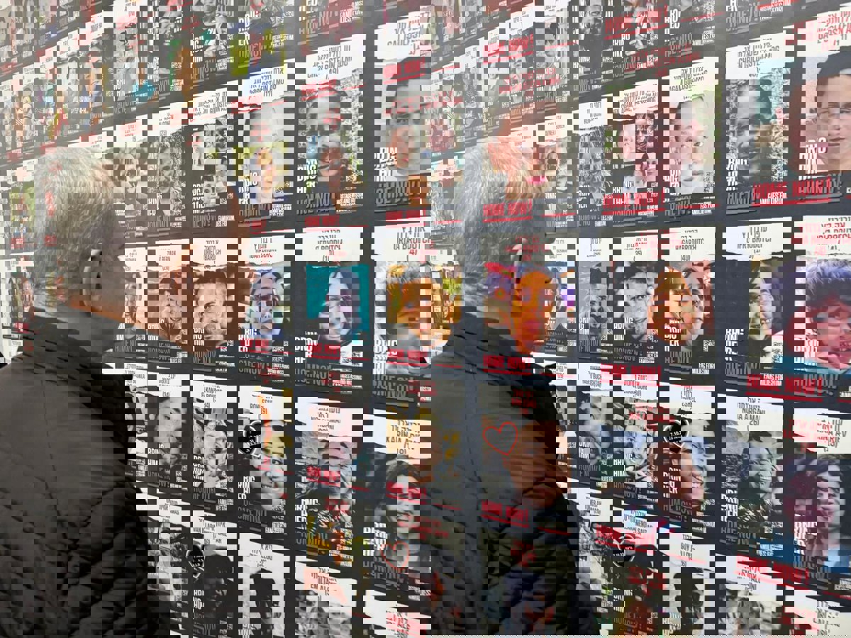 Archivo - El primer ministro de Israel, Benjamin Netanyahu, observa un mural con el rostro de los cerca de 240 rehenes tomdos por el Movimiento de Resistencia Islámica (Hamás) durante los ataques del 7 de octubre - Amos Ben-Gershom/GPO/dpa - Archivo