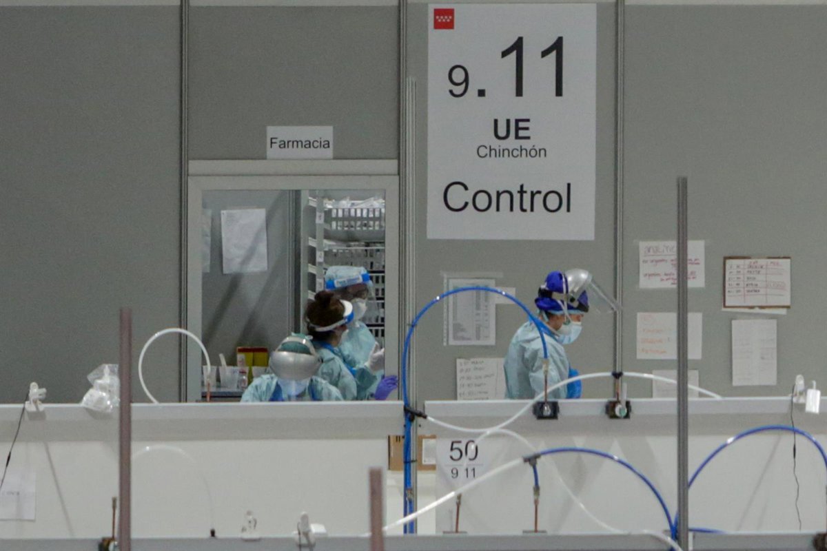 Sanitarios protegidos con mascarillas, gorros y pantallas protectoras en la puerta del almacén de material farmacéutico en el Hospital temporal de la Comunidad de Madrid habilitado en IFEMA para pacientes con coronavirus, en Madrid (España) a 31 de marzo - Ricardo Rubio - Europa Press