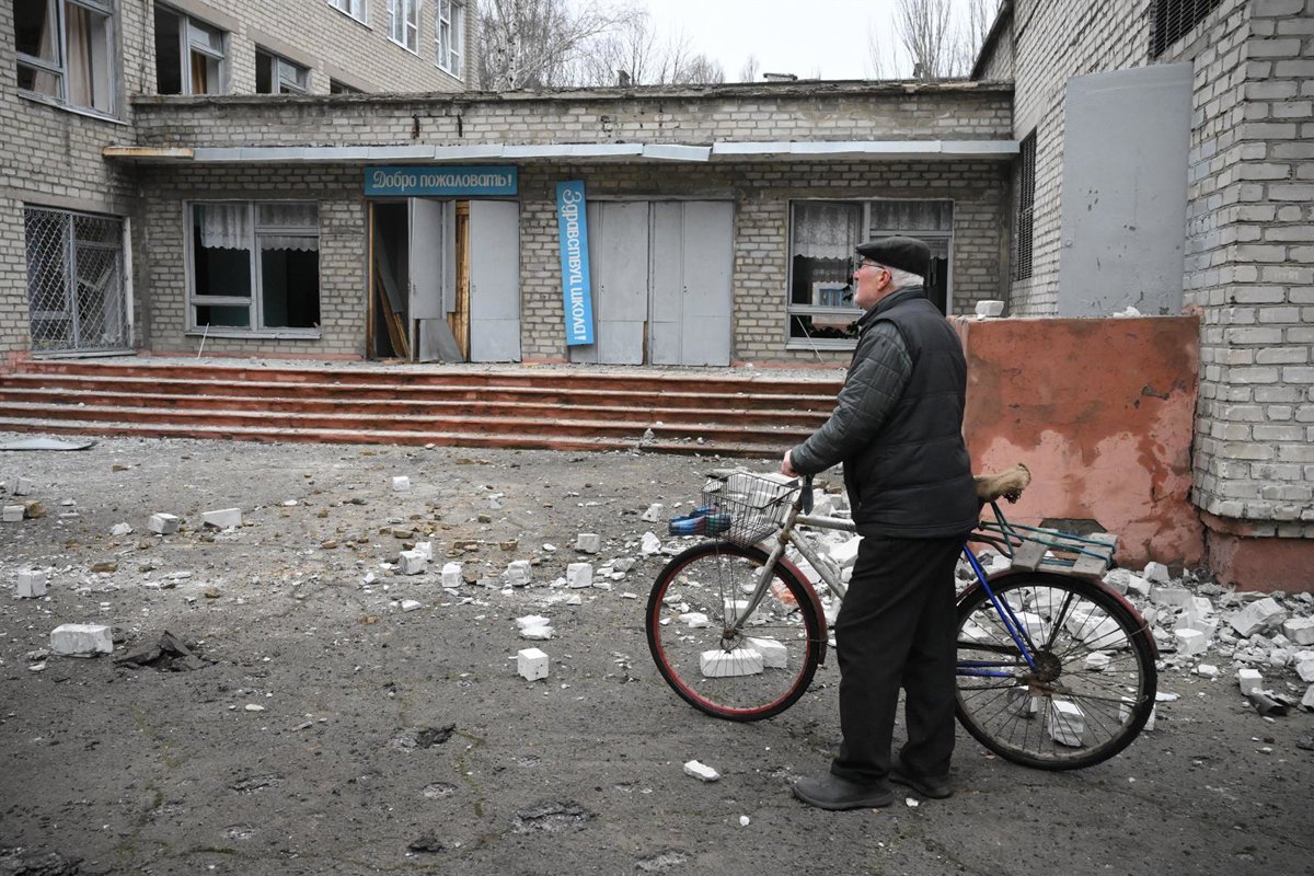 Un hombre mira las ruinas de un colegio en Donetsk en el segundo día de la invasión rusa. - Ilya Pitalev/Sputnik