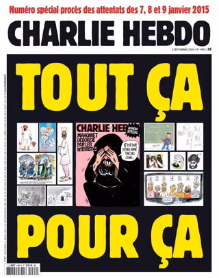 El miércoles arrancará el juicio contra los supuestos cómplices de la masacre en la sede de la publicación, en el que murieron doce personas. La revista lanza ahora una portada en la que mezcla todas las viñetas polémicas bajo el titular: "Todo eso por esto".