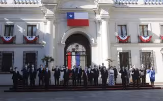 El presidente chileno, Sebastián Piñera, ha encabezado la tradicional foto de familia junto a sus ministros en el patio de Los Cañones del Palacio de La Moneda; una breve ceremonia que se ha celebrado bajo estrictos protocolos sanitarios, entre ellos el uso de mascarillas y medidas de distanciamiento social.