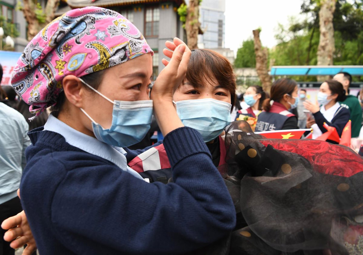 Dos trabajadoras de un hospital de Chengdu durante un acto de homenaje a los profesionales del centro fallecidos mientras luchaban contra la pandemia. - WANG XI / XINHUA NEWS / CONTACTOPHOTO