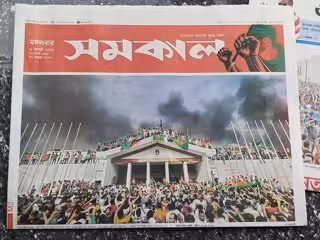 Una portada de un periódico en Bangladesh con miles de manifestantes en el Parlamento tras la huida de la primera ministra Sheij Hasina - Europa Press/Contacto/MD Mehedi Hasan