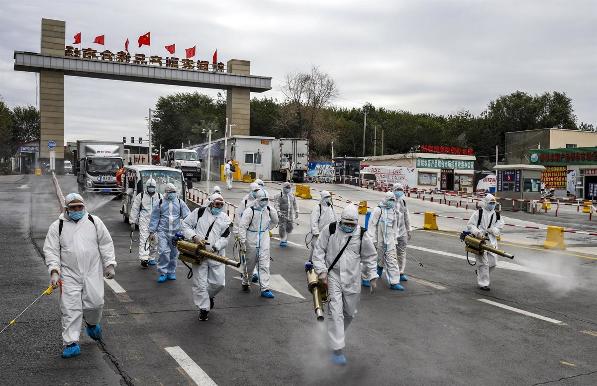 Trabajadores con trajes de protección desinfectan las calles en China por el coronavirus. - -/TPG via ZUMA Press/dpa
