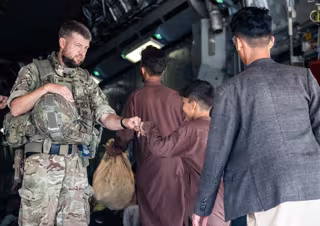 HANDOUT - 23 August 2021, Afghanistan, Kabul: A member of the UK Armed Forces fist-bumps a child evacuee at Kabul airport amid the Taliban takeover. Photo: Lphot Ben Shread/MoD/PA Wire/dpa - ATTENTION: editorial use only and only if the credit mentioned - Lphot Ben Shread/MoD/PA Wire/dpa