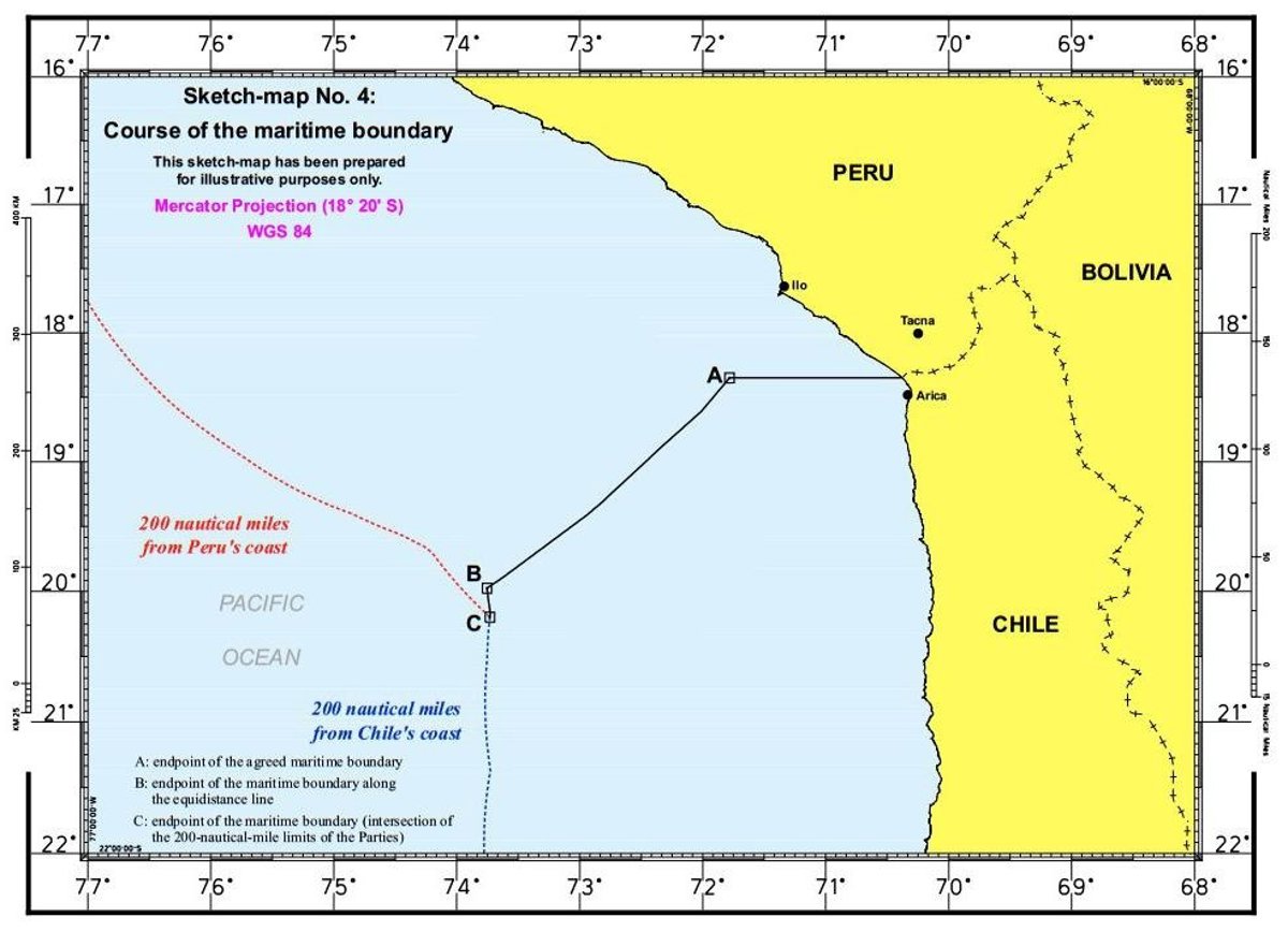 La Corte Internacional de Justicia (CIJ) ha dictado una sentencia en la que ratifica la actual frontera marítima entre Chile y Perú en las 80 primeras millas en paralelo desde la costa y concede nueva soberanía a Perú trazando una nueva línea fronteriza oblicua en dirección suroeste desde que terminan estas 80 millas hasta el límite de las aguas territoriales, a 200 millas de la costa.