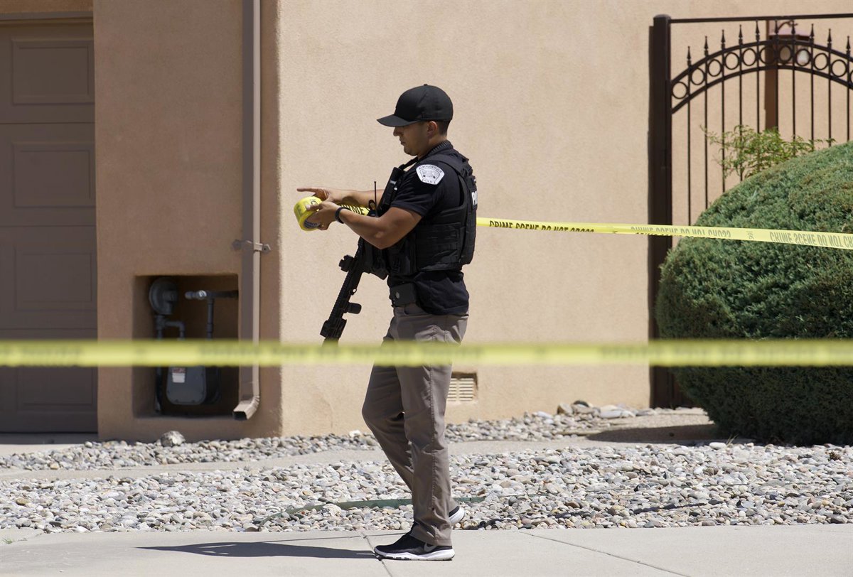 Archivo - Un oficial del Departamento de Policía de Albuquerque (APD, por sus siglas en inglés) estira la cinta criminal cerca de la Escuela Luterana Cristo después de un tiroteo cerca de la escuela Northeast Heights. - Adolphe Pierre-Louis/Albuquerque / DPA - Archivo
