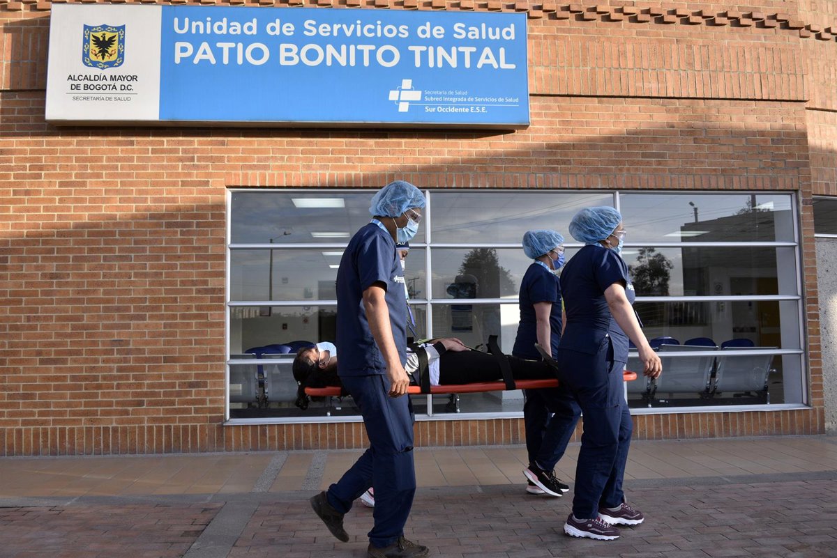 Cuatro sanitarios llevan en camilla a un paciente en Bogotá durante un ensayo de cara al comienzo de las vacunaciones contra el coronavirus en el país, que empezarán el próximo 20 de febrero. - GUILLERMO LEGARIA/GETTY IMAGES