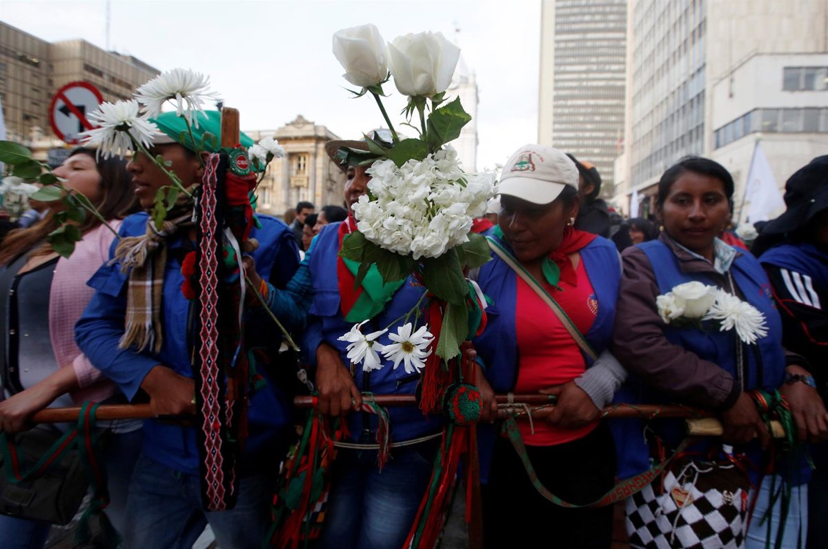 En la capital, los manifestantes, encabezados por indígenas y estudiantes cargados de rosas blancas, se han movilizado desde las 14.00 (hora local) hasta llegar al Centro de Memoria, para continuar por la carrera séptima.