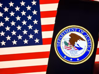 Archivo - Logo del Departamento de Justicia delante de una bandera de EEUU - Europa Press/Contacto/Taidgh Barron - Archivo