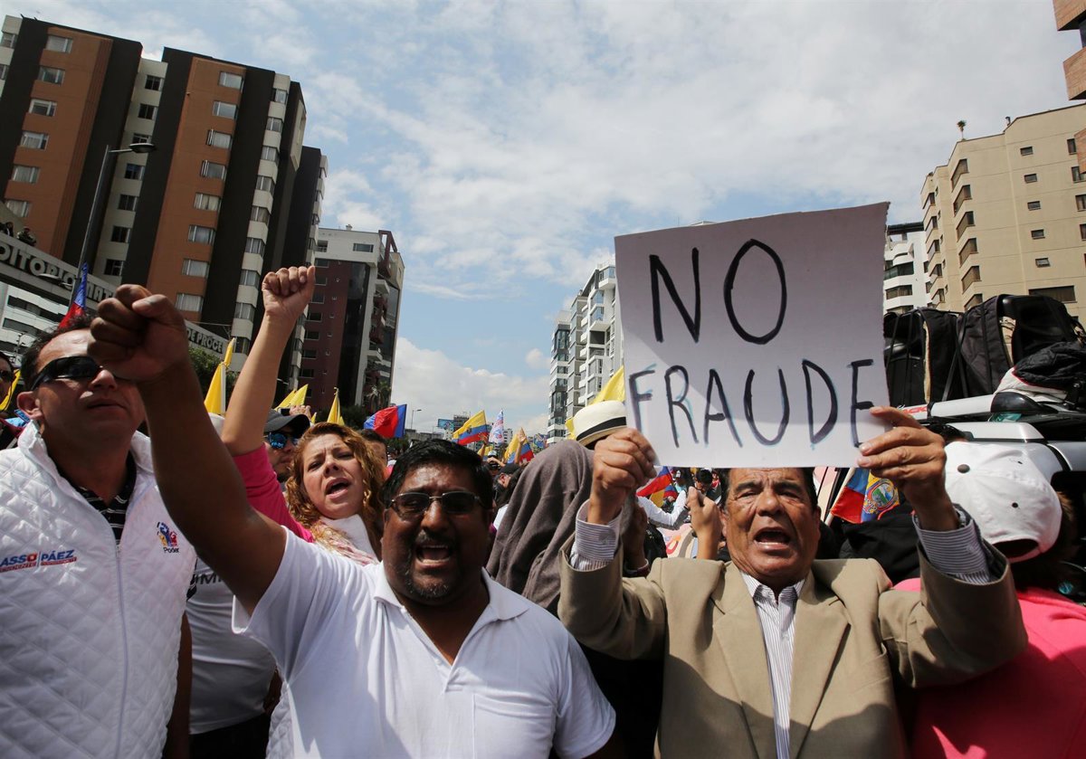 Seguidores de Lasso han salido a las calles de Quito para pedir transparencia en el proceso y alertar contra el supuesto fraude electoral. "No vamos a permitir un fraude, estamos controlando voto a voto y vamos a defender lo ganado", ha avisado el propio candidato en una entrevista.