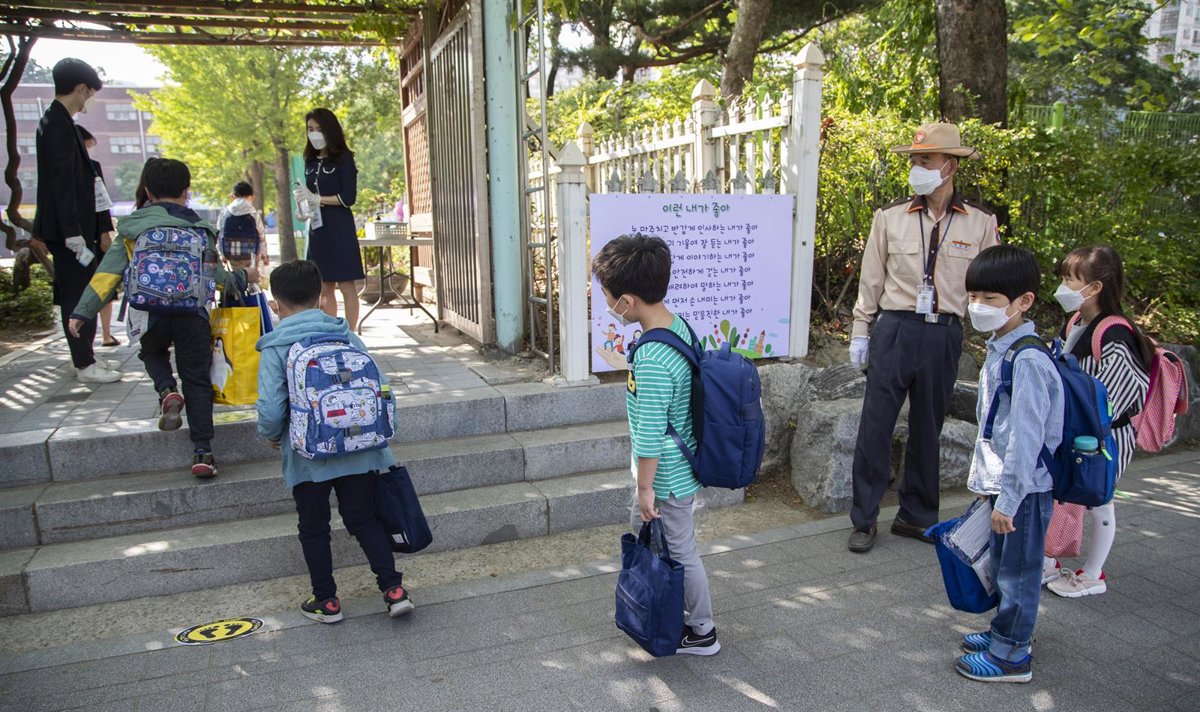 Un grupo de pequeños estudiantes retoman las clases en un escuela de Seúl, después de que las autoridades del país relajaran algunas de las medidas de prevención contra el COVID-19. - - / XINHUA NEWS / CONTACTOPHOTO