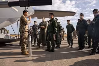 Archivo - El Capitán de la Fuerza Aérea de los EE.UU. Nestor Soriano, describe las capacidades únicas del helicóptero de combate AC-130J Ghostrider a los miembros de la Fuerza de Autodefensa de Japón - AIRMAN 1ST CLASS ALEXIS SANDOVAL - Archivo