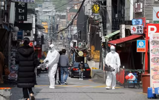 Un grupo e trabajadores desinfectan llas calles del distrito internacional de Itaewon en Seúl, la capital de Corea del Sur. - -/YNA/dpa