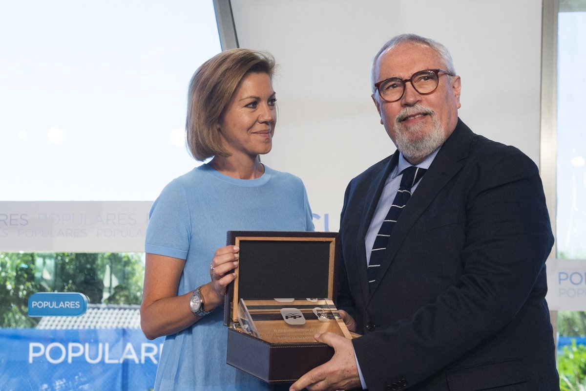 Durante su intervención en la entrega de este galardón, Cospedal ha cargado de forma indirecta contra la formación que lidera el europarlamentario Pablo Iglesias como han venido haciendo desde el jueves casi todos los participantes de la Escuela de Verano del PP, que se celebra en El Escorial (Madrid).