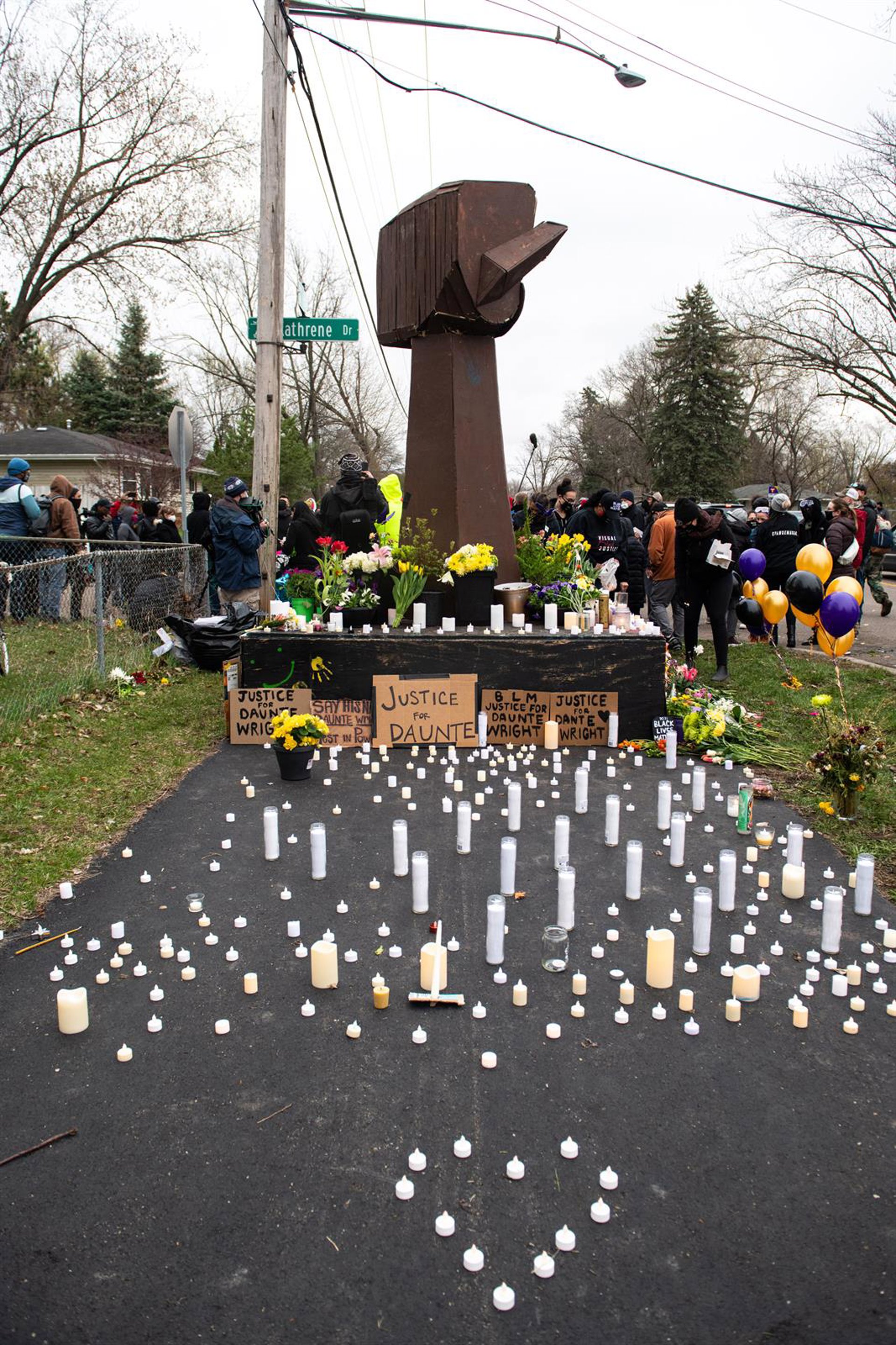 Archivo - Velas y flores depositadas en el suelo frente a un cartel del movimiento Black Lives Matter durante una vigilia en recuerdo de Daunte Wright en el lugar donde fue tiroteado mortalmente. - -/imageSPACE via ZUMA Wire/dpa - Archivo