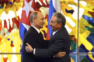 El presidente de Rusia, Putin, abraza a su homólogo de Cuba, Raúl Castro.