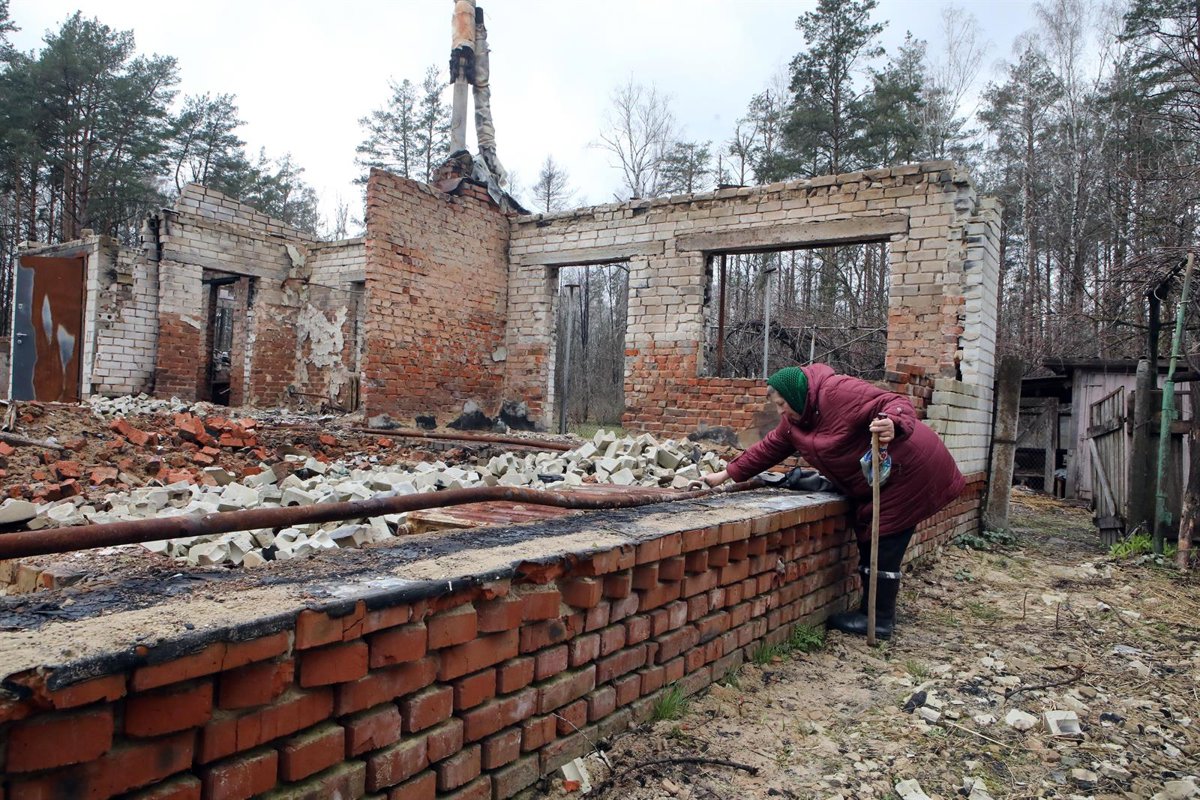 Archivo - April 3, 2023, Yahidne, Chernihiv Region, Ukraine: A senior woman picks up a brick among the ruins of a house destroyed in the shelling of Russian troops in Yahidne village, Chernihiv Region, northern Ukraine. As reported, 367 civilians were kep - Europa Press/Contacto/Volodymyr Tarasov - Archivo
