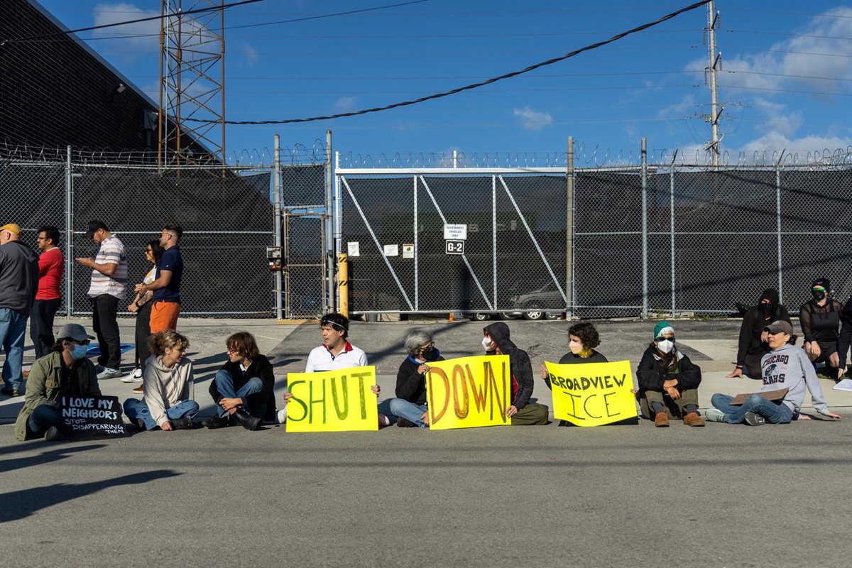 Manifestantes y activistas se sientan frente a una entrada para evitar que los vehículos ingresen a las instalaciones de Inmigración y Control de Aduanas en Broadview, estado de Illinois, Estados Unidos. - Europa Press/Contacto/Dominic Di Palermo