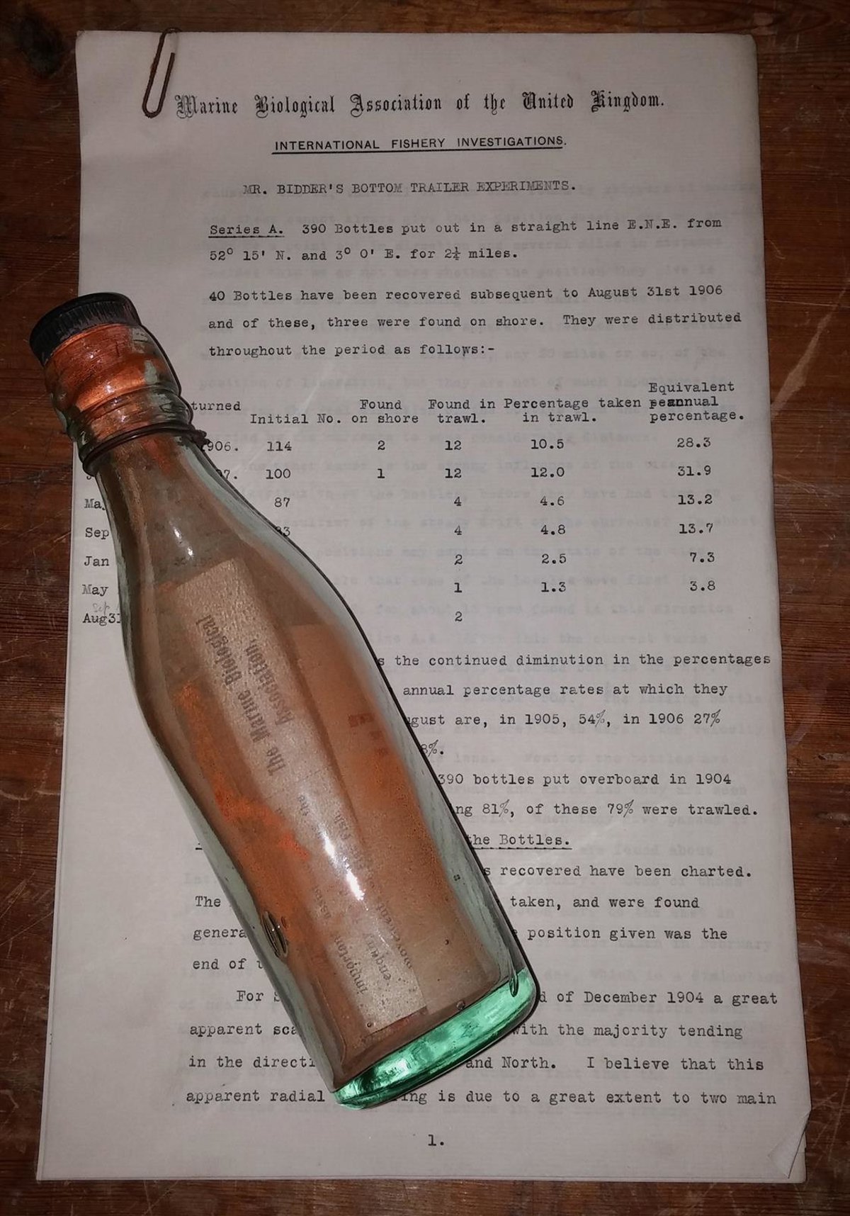 Cuando este matrimonio envió la postal de vuelta, el revuelo no se hizo esperar: la botella era una de las 1.020 que George Parker, un anterior Presidente de la entidad, había arrojado al mar entre 1904 y 1906 como parte de una investigación sobre las corrientes marinas profundas.