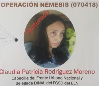 La Fiscalía General de Colombia ha informado de la detención de diez miembros de la guerrilla del Ejército de Liberación Nacional entre los que estaría la jefa del Frente Urbano Nacional del grupo insurgente, Claudia Patricia Rodríguez Moreno, alias 'Alicia' o 'Gabriela'.