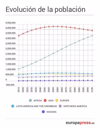 Para ese año, la ONU pronostica que 2.477 millones de personas vivirán en el continente (el 25,8% de la población mundial), lo que representará el 54% de todo el crecimiento previsto en el mundo para esa época. Para 2100, África representará el 82 por ciento del crecimiento previsto.