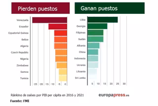 Frente a ellos, el fondo augura perspectivas negativas para Venezuela, Ecuador, Algeria, Belize, Guinea Ecuatorial, República Checa, Zimbabue, Samoa o Túnez. Todos ellos retrocederán presumiblemente según el FMI en el ranking mundial en la próxima media década.