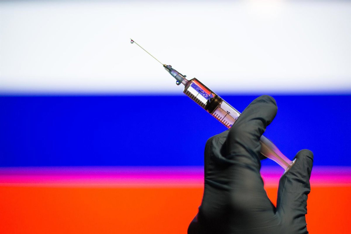 Ilustración de una vacuna con la bandera rusa de fondo - THIAGO PRUDENCIO / ZUMA PRESS / CONTACTOPHOTO