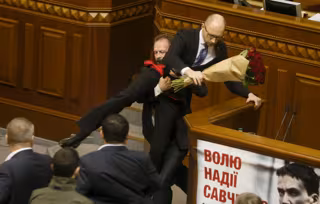 En ese momento, el diputado del partido del presidente Oleh Barna se ha puesto en pie, con un ramo de rosas rojas en las manos, y se ha aproximado al estrado, donde un sorprendido Yatseniuk ha cogido lo que le ofrecía. A continuación, el diputado ha intentado llevarse por la fuerza al primer ministro, que se ha aferrado al atril, ante lo cual Barna ha optado por cogerle en brazos.