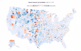 Este otro mapa refleja quién ha ganado en búsquedas en Google en cada territorio desde septiembre. Como se observa en el gráfico, Trump ha ganado todas las semanas, excepto dos, la del 17 de septiembre y esta última de noviembre, en la que Clinton se ha alzado vencedora.