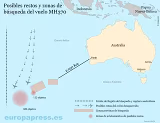 El punto en el que se encontraban los objetos está situado a unos 2.700 kilómetros de Perth y a unos 200 kilómetros de la primera zona en la que se estaba buscando esta semana la aeronave desaparecida. Algunos de los objetos miden dos metros de largo.