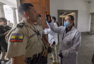 Personal médico comprueba la temperatura de varios agentes de la Policía de Ecuador, en medio de la crisis sanitaria de la COVID-19. - SANTIAGO ARMAS / ZUMA PRESS / CONTACTOPHOTO
