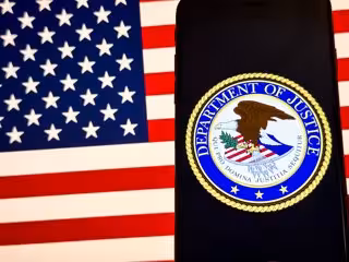 Archivo - Logo del Departamento de Justicia delante de una bandera de EEUU - Europa Press/Contacto/Taidgh Barron - Archivo