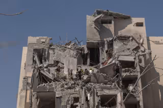 24 June 2025, Israel, Beer Sheva: First Responders search for victims in a destroyed building after an Iranian missile. Photo: Ilia Yefimovich/dpa - Ilia Yefimovich/dpa