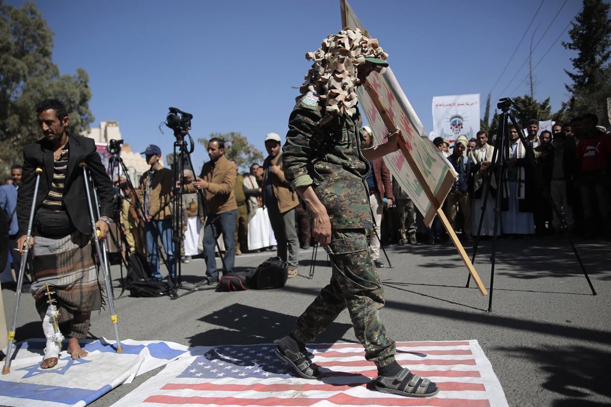 Archivo - Un soldado houthi camina sobre una bandera estadounidense durante una protesta frente a la embajada de Estados Unidos en Saná. - Hani Al-Ansi/dpa - Archivo