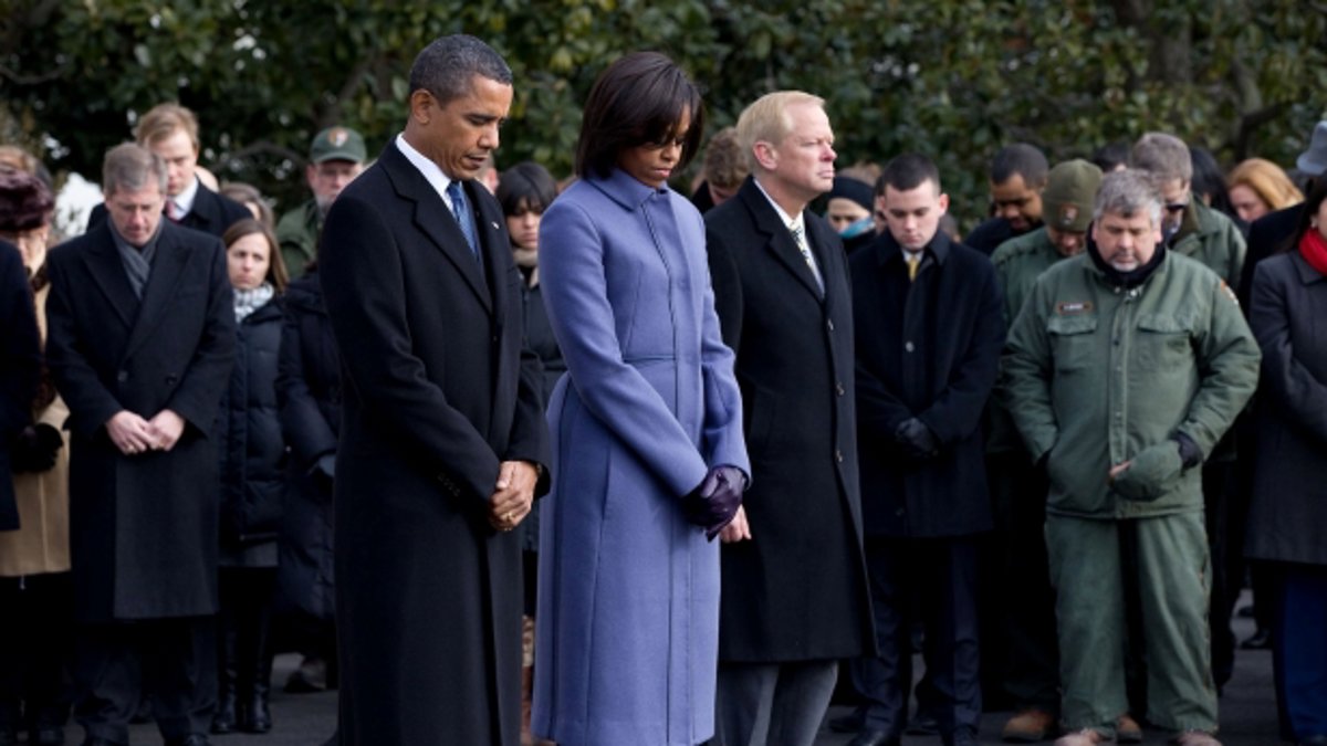 Los Obama guardaron el minuto de silencio de pie, con gesto serio y la cabeza baja, en el jardín sur de la Casa Blanca. La pareja presidencial salió de la residencia oficial y se sumó a otros funcionarios y se sumaron al silencio absoluto que se hizo tras un toque de campana de un guardia de los Marines que sonó exactamente a las 11.00 (17.00 hora peninsular española).