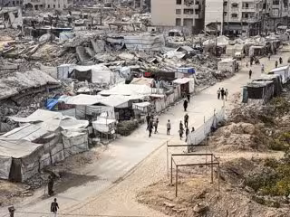 Palestinos en una calle junto a tiendas de campaña para desplazados en la ciudad de Gaza, en medio de los daños causados por la ofensiva de Israel contra la Franja de Gaza (archivo)- Europa Press/Contacto/Belal Abu Amer